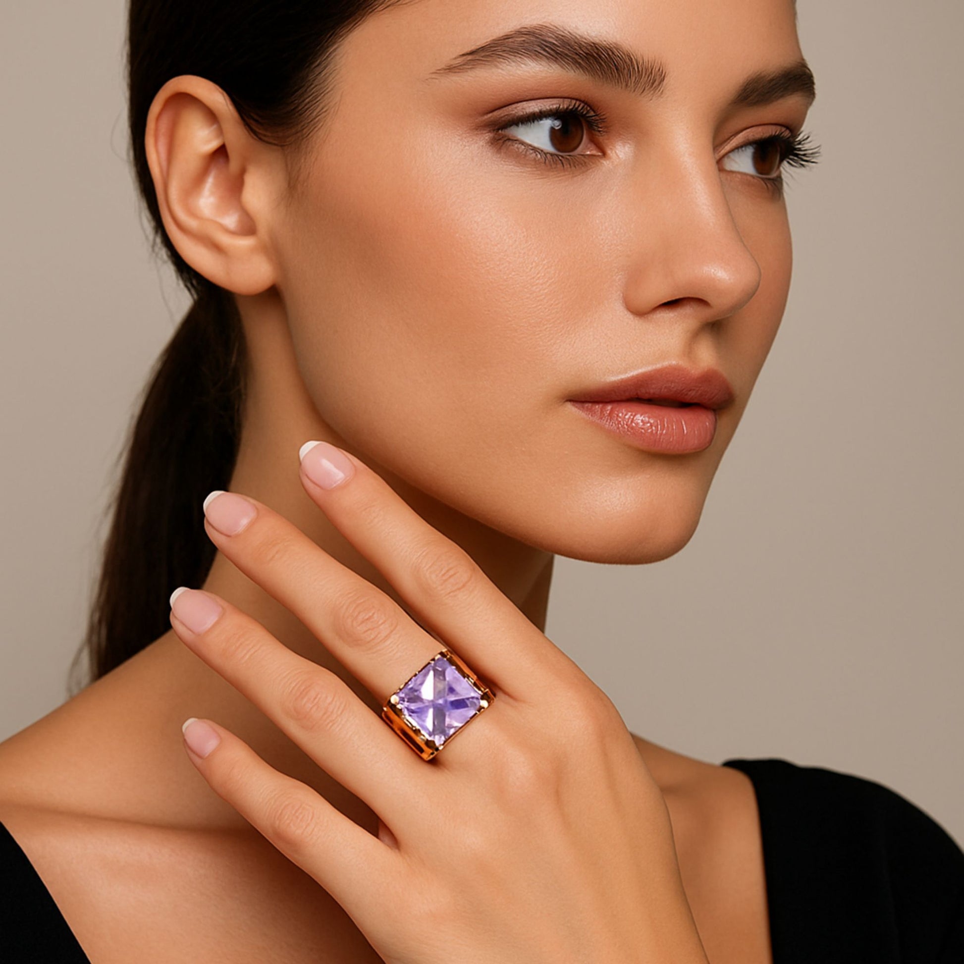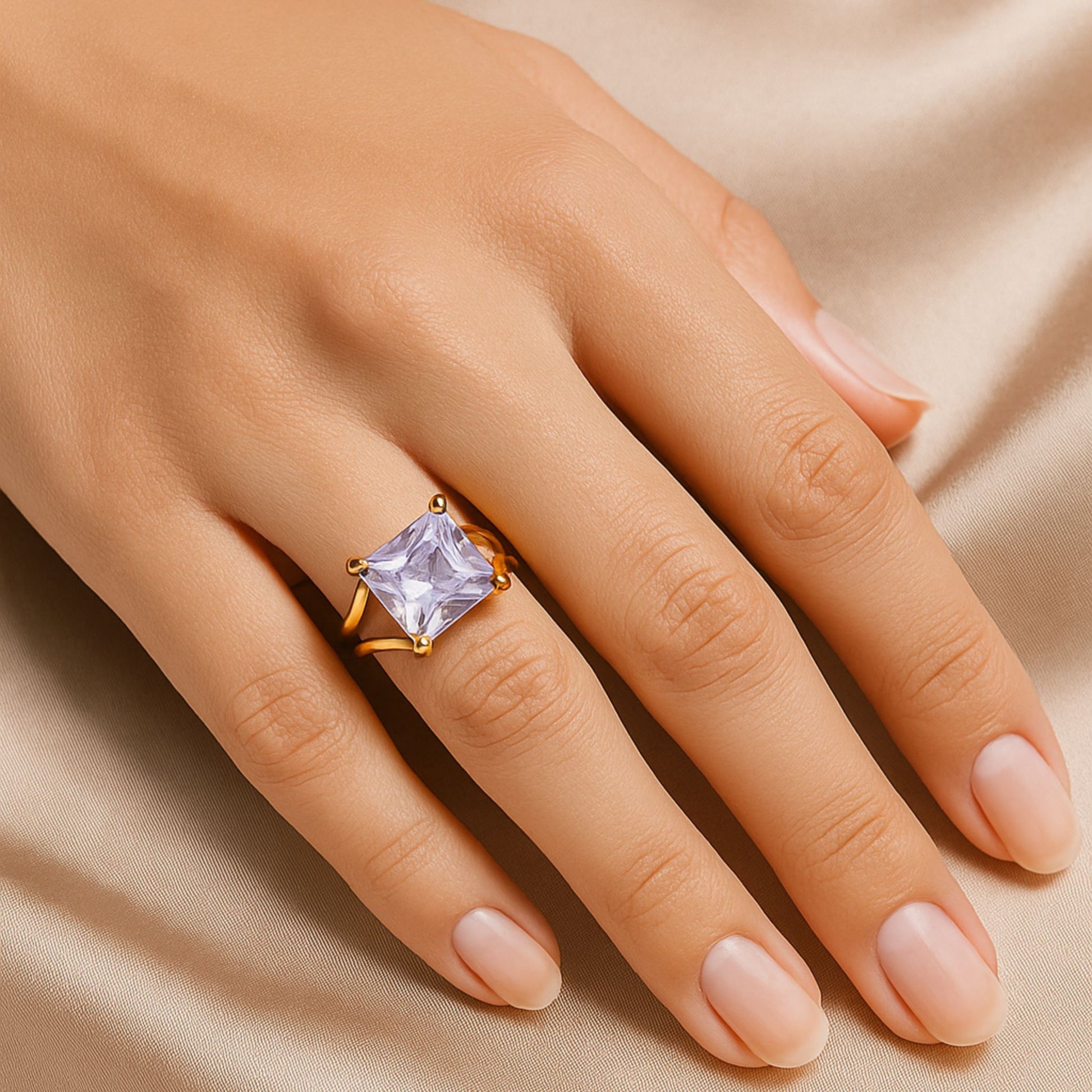 Let your style blossom with the serene elegance of our "Twilight Petal" Ring. This enchanting piece features a captivating floral motif, meticulously crafted from five brilliant pear-cut gemstones in a soft lavender hue. These exquisite petals are arranged around a central accent stone, all set on a warm, polished gold-tone band. This ring is the perfect accessory for adding a delicate, feminine touch to your everyday look or for special occasions.