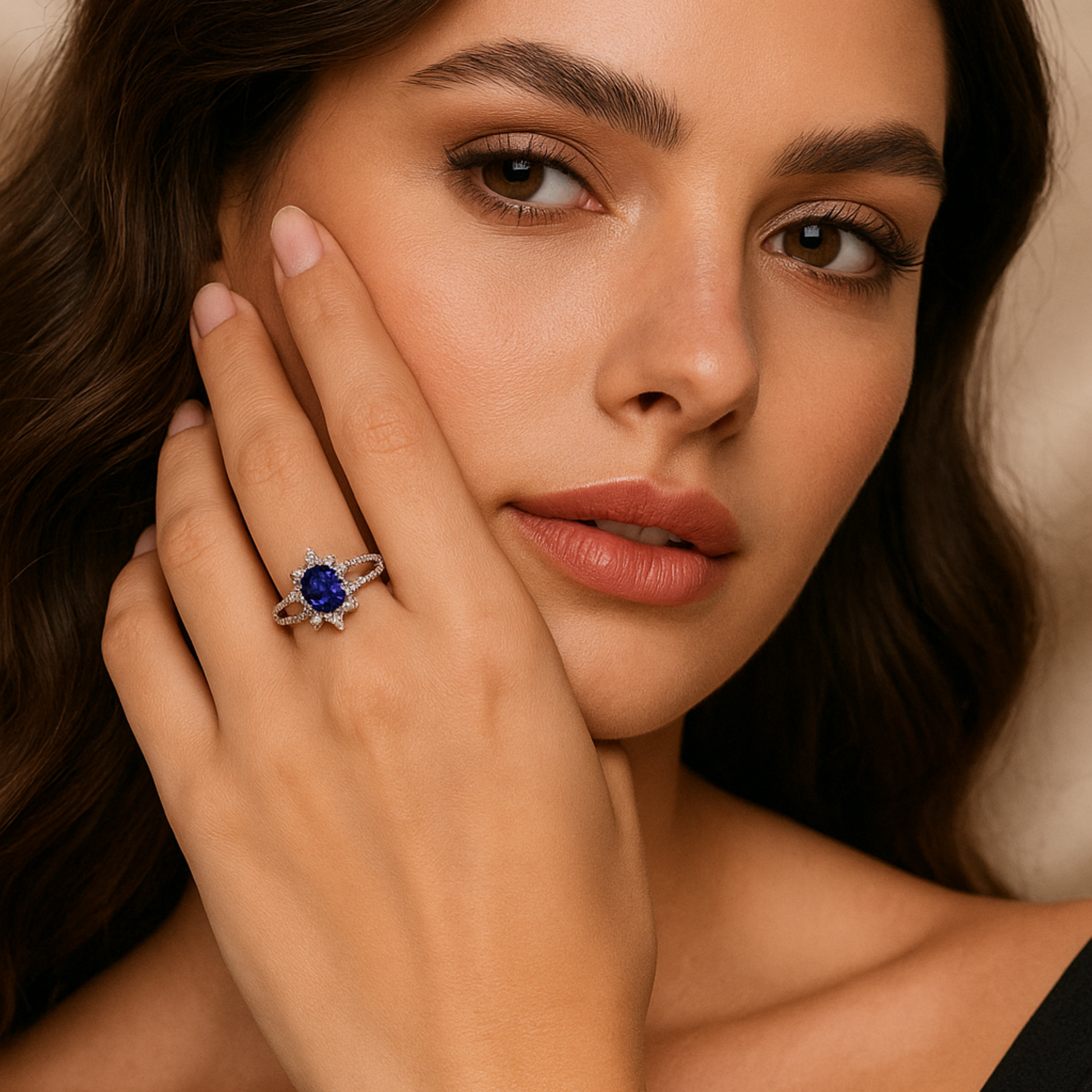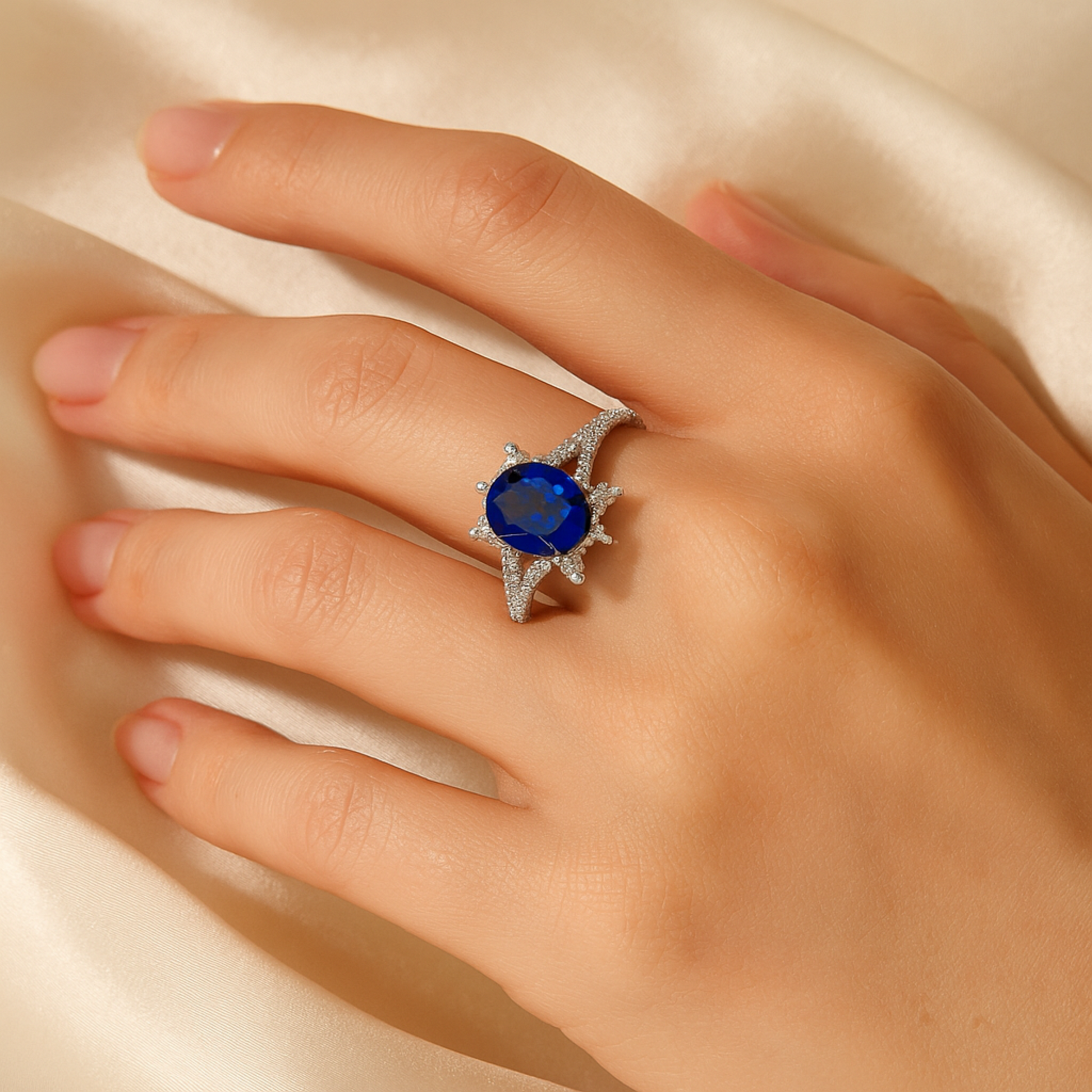 Reach for the stars with our mesmerizing "Celestial Sparkle" Blue Statement Ring. This breathtaking piece is designed to capture the mystical beauty of the night sky, bringing a touch of cosmic elegance to your hand.