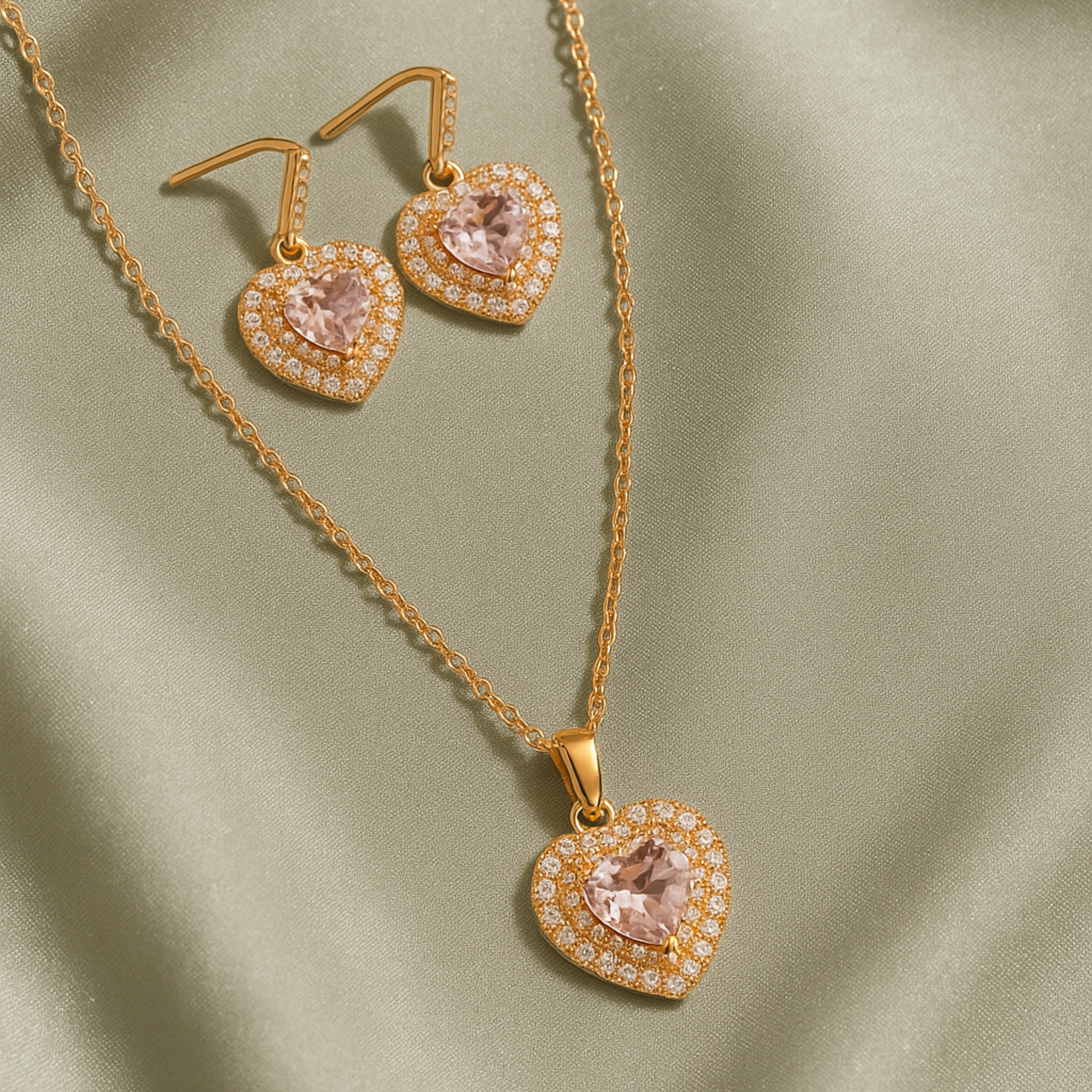 Capture hearts and turn heads with this exquisitely designed matching jewelry set. Featuring a stunning heart-shaped centerpiece stone surrounded by a brilliant halo of sparkling crystals, this necklace and earring duo exudes romance and sophistication. The warm gold-tone setting enhances its radiant glow, making it a perfect gift or a beautiful addition to your own collection.