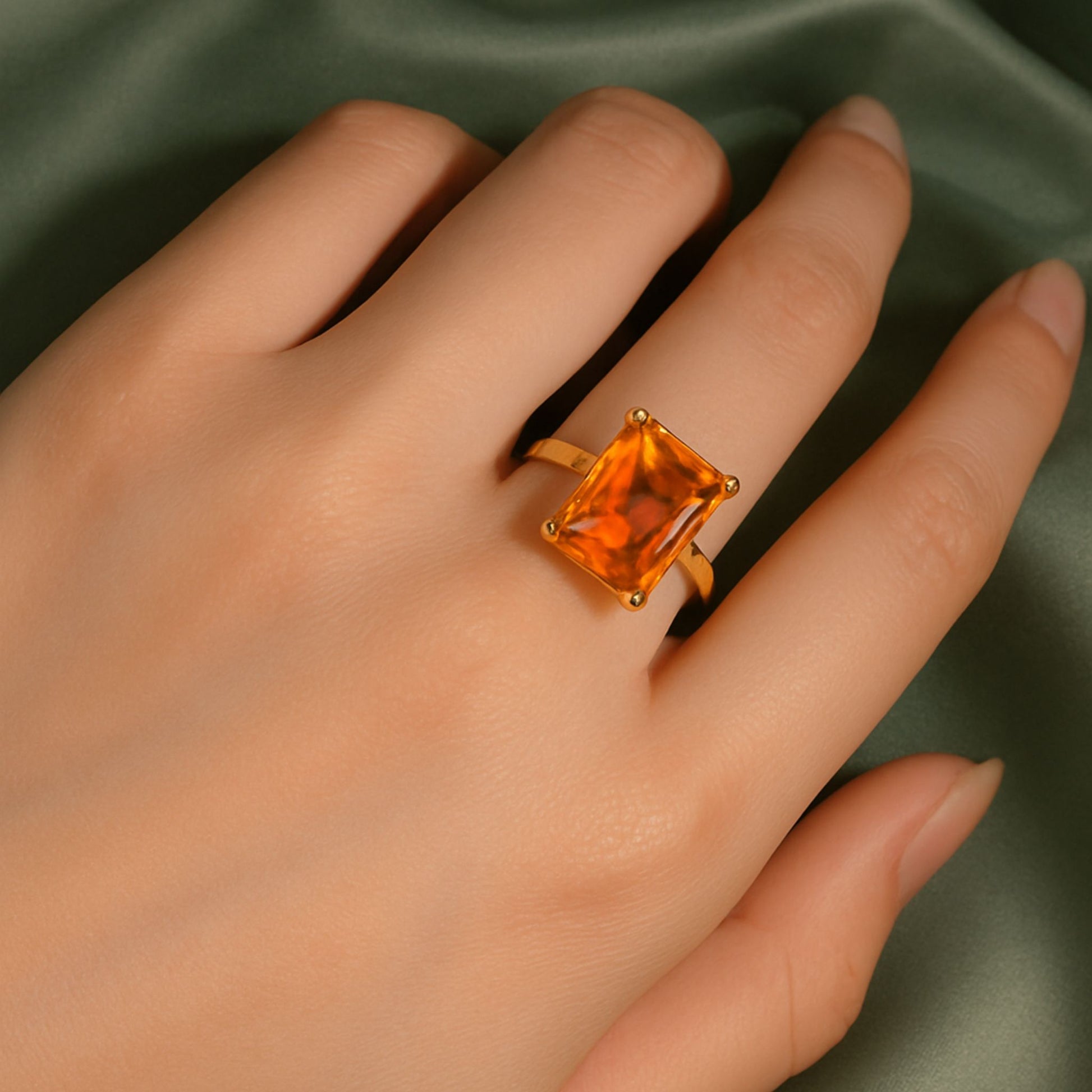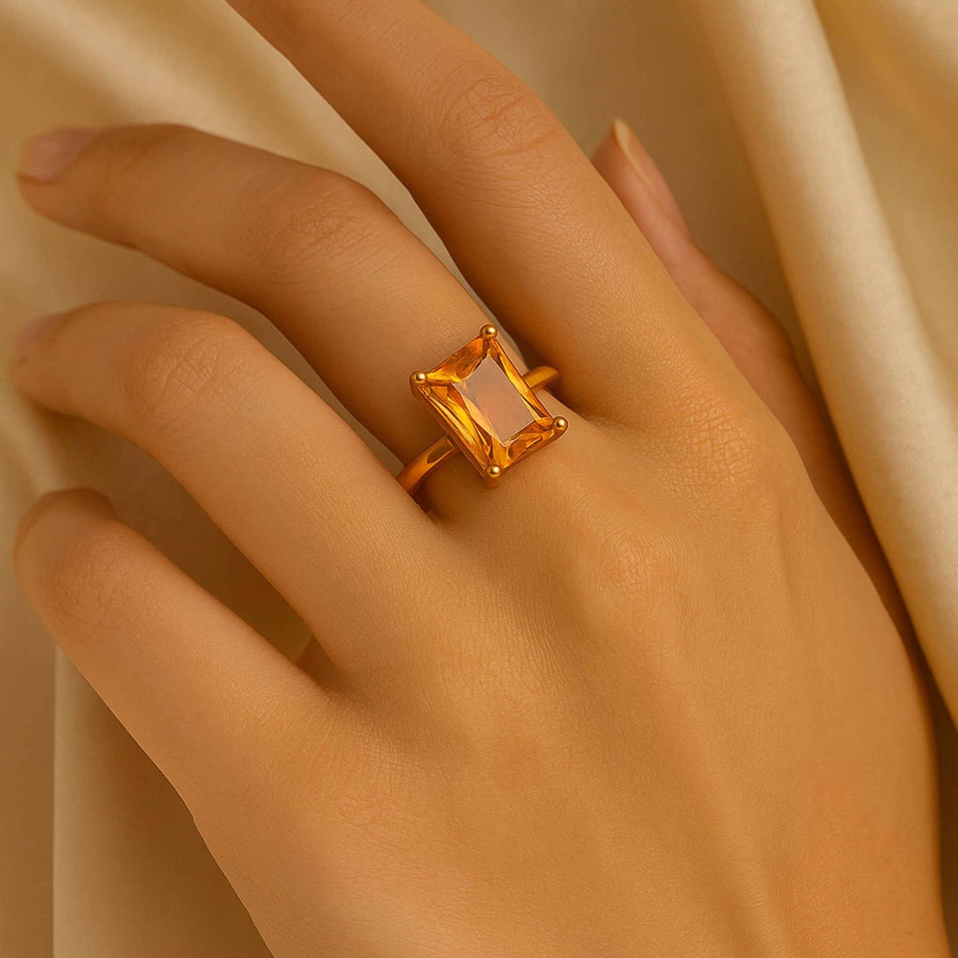 Capture the warm glow of a setting sun with our stunning "Golden Sunset" Emerald Cut Ring. This captivating piece is designed to infuse your look with a touch of radiant warmth and sophisticated charm, perfect for adding a pop of color to any ensemble.